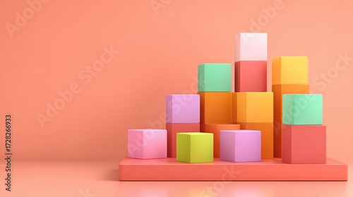 Colorful geometric blocks arranged in a step-like formation on a pastel pink background for modern abstract design and playful visual art