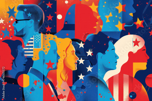 Colorful Geometric Illustration Featuring Diverse Groups of People and Stars. Concept of American President Elections.