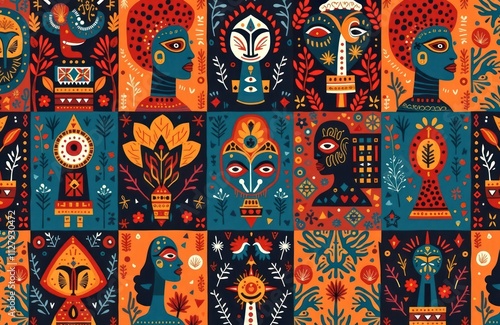 Colorful geometric masks, symbols create vibrant African-inspired design. Pattern features various shapes, forms. Decorative elements evoke culture, nature. Suitable for fabric design, home decor,