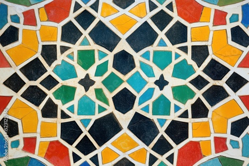 Colorful geometric patterns create intricate designs in traditional tile work, showcasing artistry and craftsmanship in mosaic style