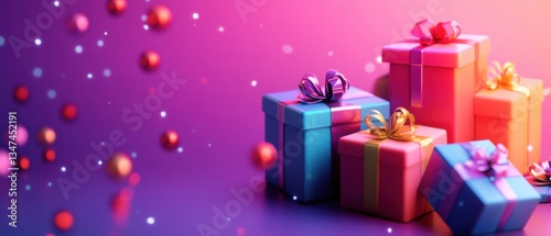 Colorful gift boxes with ribbons on a vibrant pink and purple background with bokeh lights Concept of celebration, holidays, and special occasions