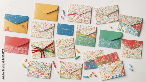 Colorful gift cards with envelopes, holiday patterns, isolated on white.