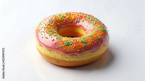 Colorful glazed donut on a white background with subtle texture and slight shine effect, baked good, donut, baked good