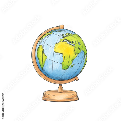 Colorful globe on wooden stand, showcasing continents and oceans in playful design