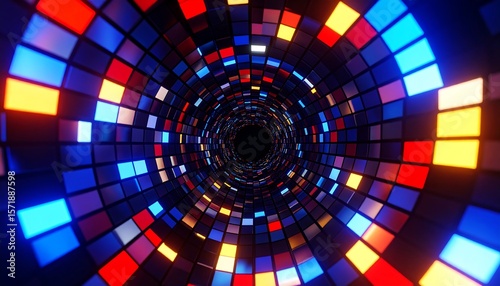 Colorful, glowing squares form a tunnel