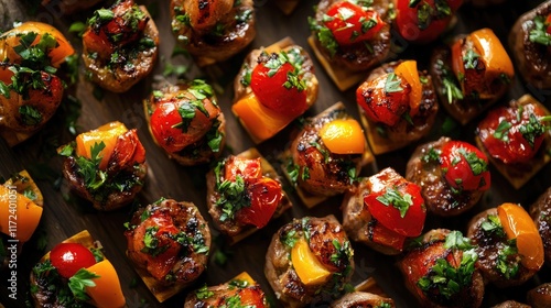 Colorful gourmet appetizers arranged on a wooden platter featuring fresh vegetables and vibrant herbs for a festive occasion.