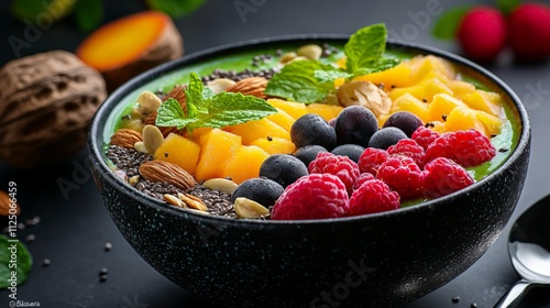 Colorful Green Smoothie Bowl with Fresh Fruit and Nuts
