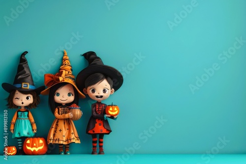 Colorful Halloween dolls in witch costumes, holding pumpkins, perfect for festive decorations and seasonal celebrations.