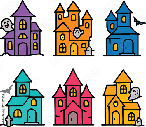 Colorful Halloween Haunted House Icon Pack: Set of 6 Different Spooky House Illustrations with Unique Designs on a White Background