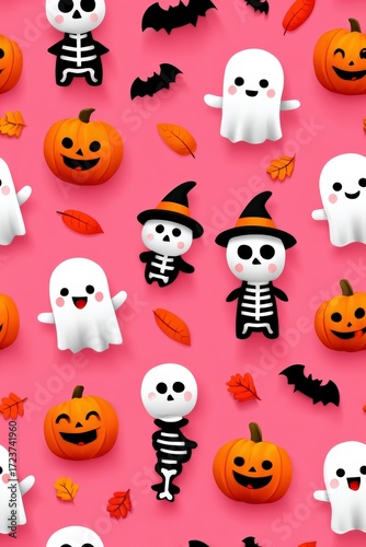 Colorful Halloween Pattern with Ghosts, Pumpkins, and Bats