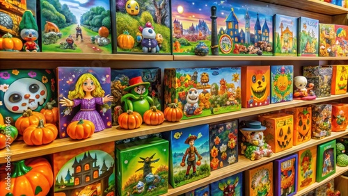 Colorful Halloween-themed board games, puzzles, and activity sets for kids, featuring spooky yet friendly characters, on a shelf, ready for purchase.