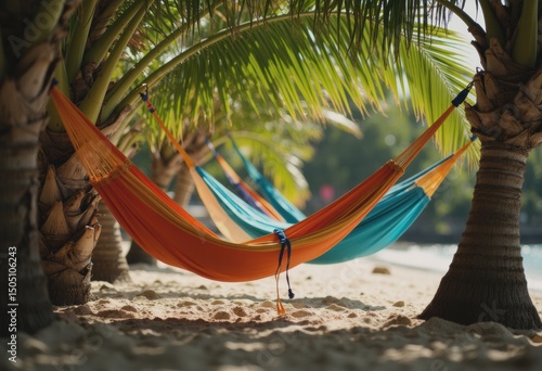 Colorful hammocks gently swaying between palm trees on a serene beach