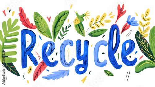 Colorful hand drawn recycle lettering with tropical leaves and flowers on white background. Reduce, reuse, recycling eco concept