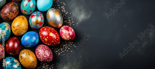 Colorful handcrafted easter eggs on blue backdrop with minimalistic concept and top down perspective