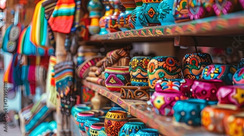 Colorful handcrafted pottery and textiles displayed on shelves in a vibrant market setting