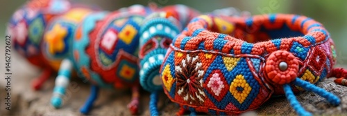 Colorful handcrafted woven bracelets with geometric patterns on wooden surface
