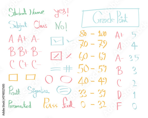 Colorful handwritten student grade chart template, academic grading scale vector, school result sheet design with marks range, grade points, pass fail boxes, editable education illustration.