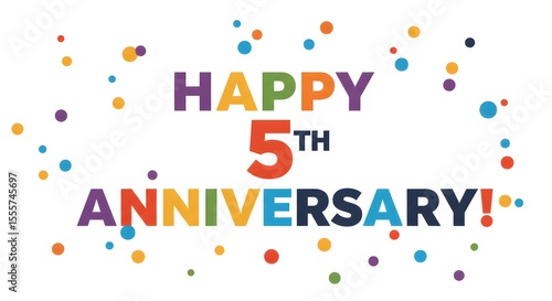 Colorful HAPPY 5th ANNIVERSARY! with dots on white background perfect for digital banners or social media graphics.