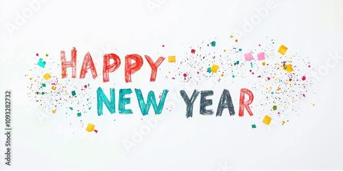 Colorful Happy New Year celebration with festive confetti and vibrant text design.