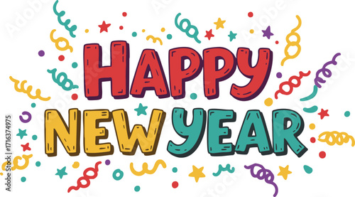 Colorful happy new year greeting with confetti and stars for festive celebrations
