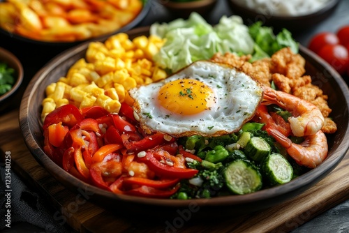 Colorful healthy food bowl, shrimp, egg, vegetables