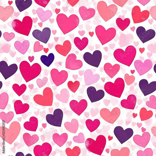 Colorful heart pattern with various shades of pink and purple on white background, creating cheerful and romantic atmosphere. Perfect for Valentine Day or love themed designs