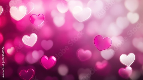 Colorful heart-shaped bokeh lights in shades of pink and white create a romantic atmosphere, perfect for celebrations of love and affection.