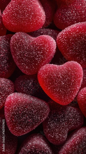 Colorful heart-shaped candy in a pile with a sparkling coating creating a romantic and sweet atmosphere