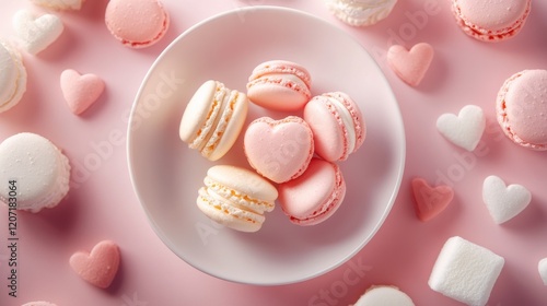 Colorful Heart-Shaped Macarons on a Pink Background Dish