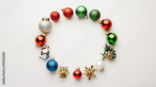 Colorful holiday ornaments arranged in a circular pattern on a white surface, capturing the festive spirit of the Christmas season