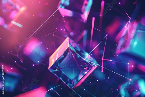 Colorful Holographic Geometric Shapes Stack on Dark Background - 3D Digital Art in Blue, Purple, and Green