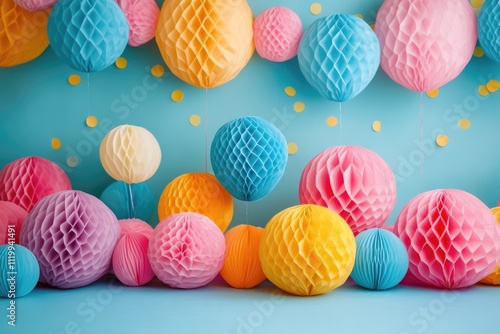 Colorful honeycomb paper balls hanging and resting on blue surface with confetti