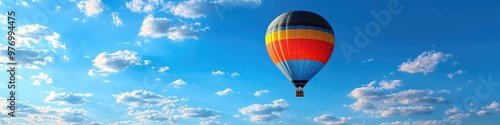 Colorful hot air balloon ascends in blue sky with scattered clouds