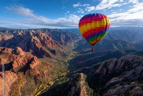 Colorful hot air balloon floats over striking canyon landscape at sunrise