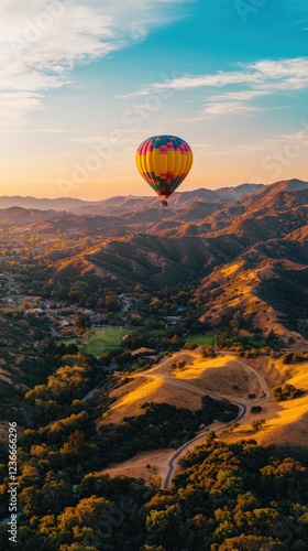 Colorful Hot Air Balloon Gliding Over Scenic Mountainous Landscape at Sunset