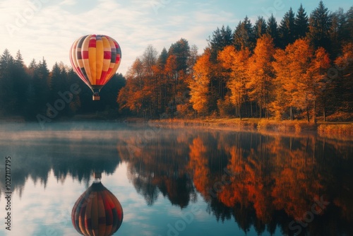 Colorful Hot Air Balloon Over Autumn Lake Reflection