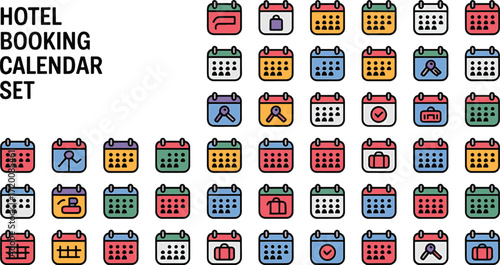 Colorful hotel booking calendar icon set for travel planning and reservations