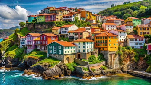 Colorful houses perched on cliffs overlooking the picturesque coastal village of Cudillero in Asturias