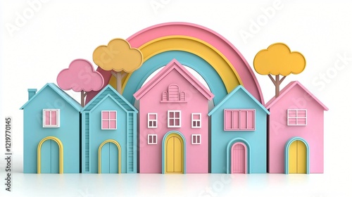 Colorful houses, rainbow, trees; idyllic neighborhood illustration. Use children's book