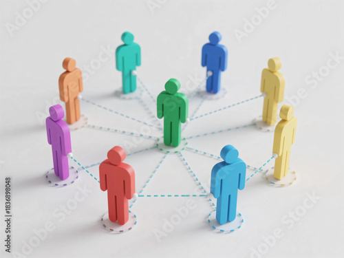 Colorful Human Figures Connected by Dotted Lines on White Background Representing Social Networking, Teamwork, Leadership, and Community Structure