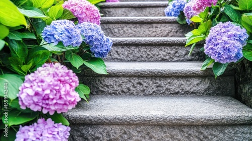 Colorful Hydrangea Flowers Along Stone Steps in a Spring Garden