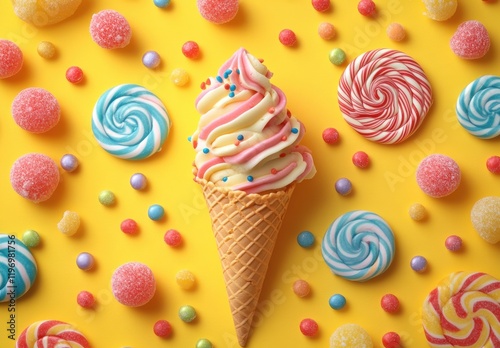 Colorful Ice Cream Cone Surrounded by Assorted Candy on a Bright Yellow Background, Perfect for Summer Treats and Sweet Desserts