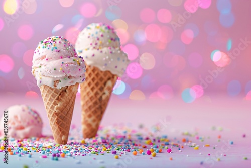 Colorful Ice Cream Cones with Sprinkles on Pastel Background