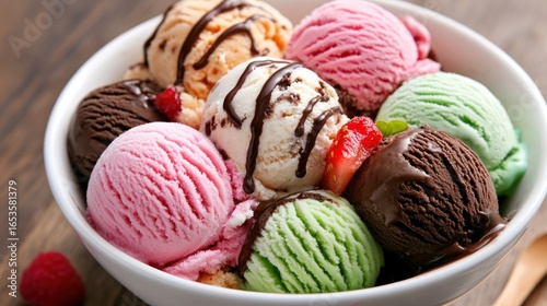 Colorful ice cream scoops in a bowl, drizzled with chocolate sauce