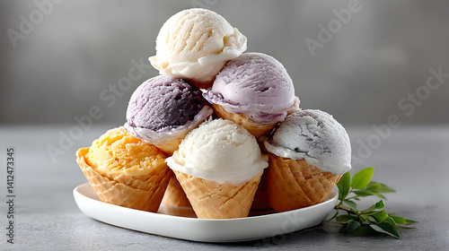 Colorful ice cream scoops in waffle cones, arranged in a pyramid on a white plate
