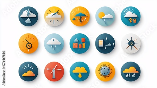 Colorful icon set depicting a wide range of weather conditions and atmospheric phenomena including sunny days cloudy skies rainstorms wind gusts and more