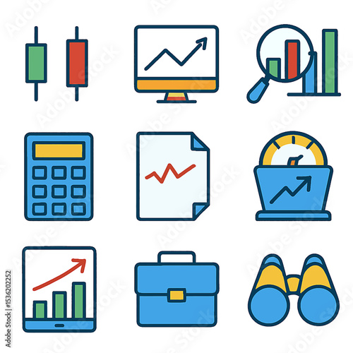 Colorful icons depicting financial analysis tools and upward trending graphs.