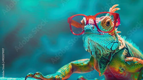 Colorful Iguana Wearing Red Glasses on a Turquoise Background - Whimsical and Fun Animal Portrait for Creative Spaces