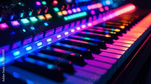 Colorful illuminated keys of a synthesizer during a music production session at night