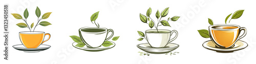 Colorful illustrated cups with leaves and plants representing nature on transparent background